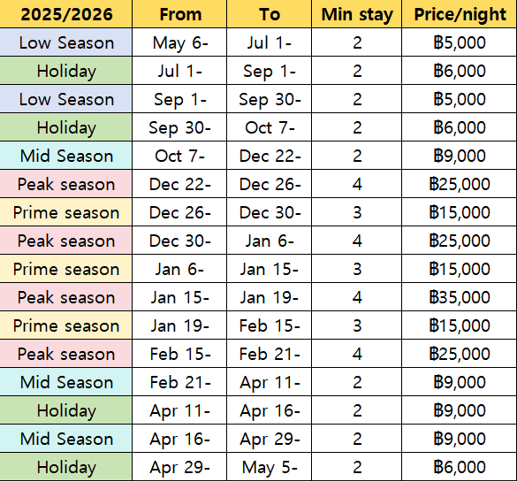 Villa housekeeper, gardener, security guard, chef service,breakfast, afternoon tea, massage are available at an additional cost